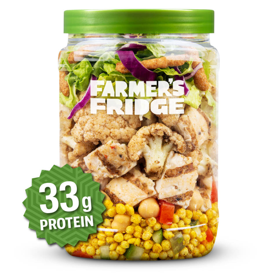 - Grilled Chicken Breast (Chicken Boneless/Skinless Breast With Rib Meat, Water, Sea Salt, Dehydrated Garlic, Dehydrated Onion, Spice, Vinegar, Sugar, Dehydrated Bell Peppers and Parsley), Couscous (Water, Wheat Flour), Cauliflower Florets, Garbanzo Beans (Cooked Chickpeas, Water, Salt), Green Leaf Lettuce, Roma Tomatoes, Cucumber, Sesame Sticks (Enriched Wheat Flour [Unbleached Wheat Flour, Malted Barley Flour, Niacin, Reduced Iron, Thiamine Mononitrate, Riboflavin, Folic Acid], Soybean Oil, Sesame Seeds, Bulgur Wheat, Salt, Beet Powder [Color], Turmeric [Color]), Dill Pickle (Cucumbers, Water, Salt, Vinegar, Turmeric, Natural Spices), Red Onion, Red Cabbage, Canola Oil, Coarse Sea Salt (Sea Salt, Yellow Prussiate of Soda to Prevent Caking), Lemon Juice, Coriander, Cumin, Black Pepper, Garlic Powder, Turmeric, Allspice